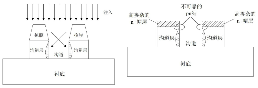 如上图(左)所示,沟槽型JFET的一种制备方法是在通过离子注入形成栅的过程中,不主动对沟道侧壁进行离子注入,采用这样的方式注入的离子束是平行离子束。