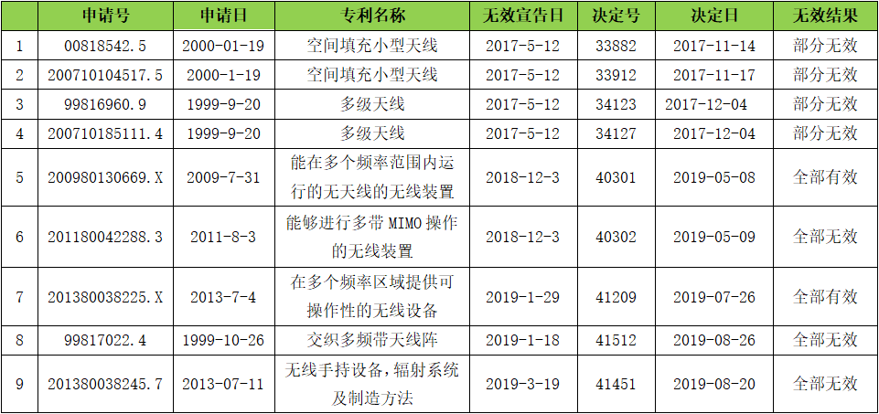 统计弗拉克托斯公司的在国知局历来的专利无效情况,不难发现:其中与vivo案件时间点契合的专利为序号为5~9的专利,主要为通信天线技术专利,其中还包括一件关于MIMO技术的专利。但是就已经公布的无效决定来看,5件专利已有3件被全部无效,无效成功率已经很高,剩下的两件专利应为双方本次的开庭主要争议点。但是近几年来vivo的研发实力不断提升,知识产权意识及防御能力不断增强,相信在这样的诉讼中也不会太吃亏。